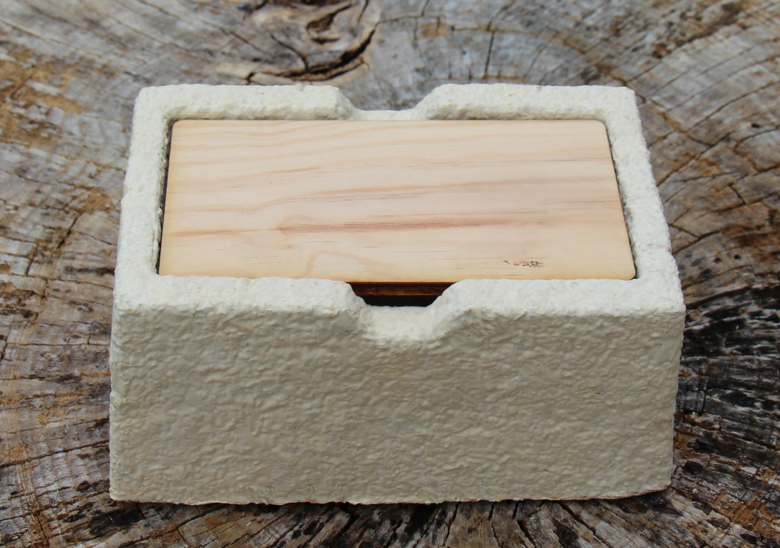 La boite est cultivée avec la matière Embelium – 100% naturel et compostable – made in locale – Issue de la terre, elle pourra avoir plusieurs vies avant de retourner à la terre sous forme de compost naturel. Le couvercle bois apporte une touche originale et vous permet de poser votre étiquette ou votre logo. La boite peut être enduit de cire, ou peinte. Dimensions Ext. 170*110*75 mm – Dimensions Int. 120*70*40mm